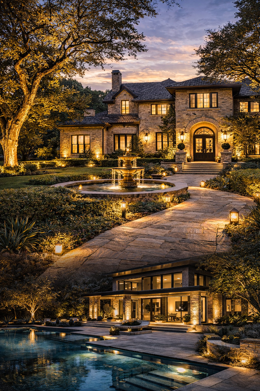Dallas landscapes are defined by their mature tree canopies, manicured formal gardens, and the generous lot sizes that the Park Cities and Prestonwood corridors are known for. These properties respond beautifully to layered outdoor lighting — specimen trees uplighted to reveal their structure, garden beds accented with subtle downlighting, and pathways defined with fixtures that serve both safety and composition.